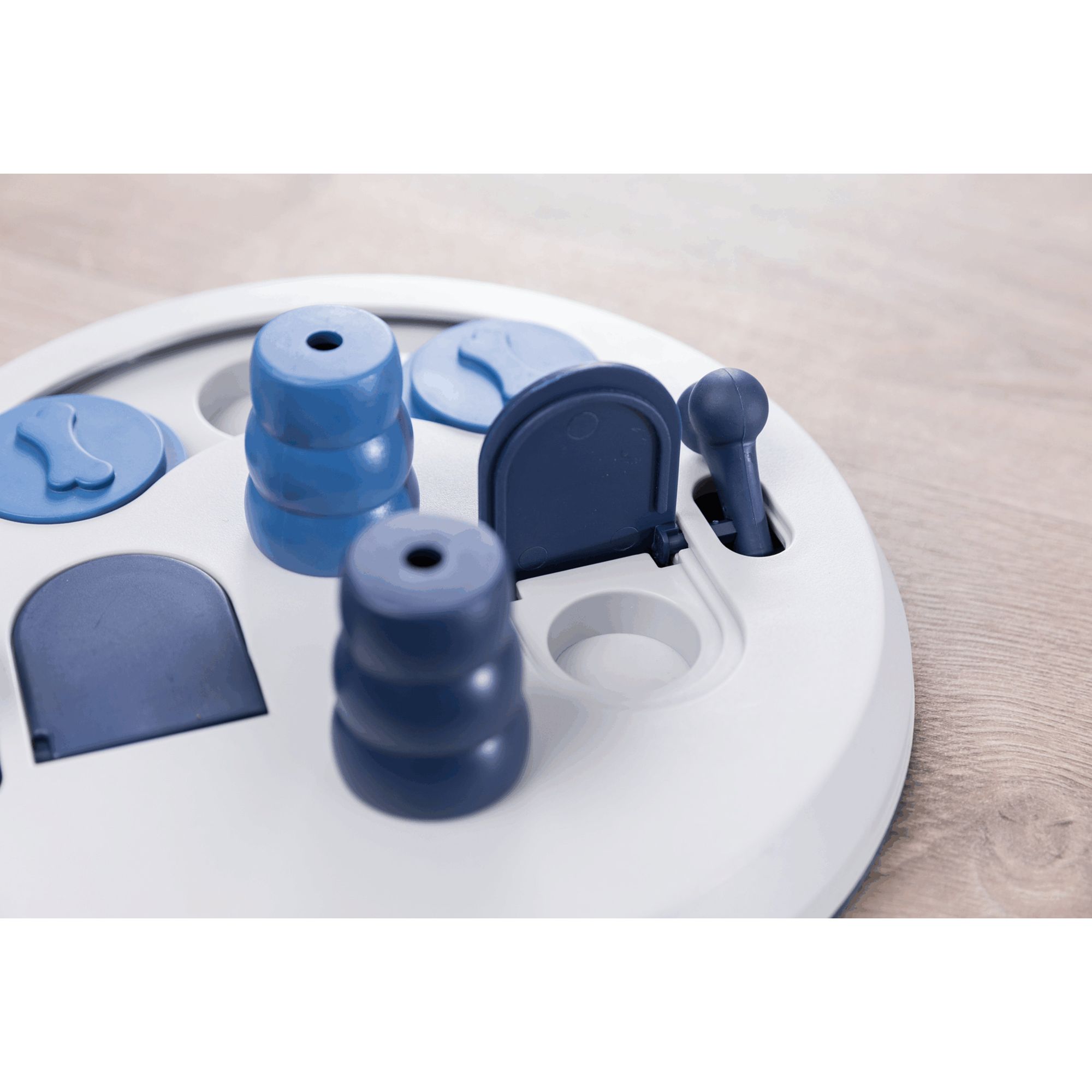 Trixie flip board strategisch spel een level 2 intelligentiespel waarbij de hond verschillende kegels en kommetjes moet omdraaien om daaronder hondensnacks te kunnen vinden.
